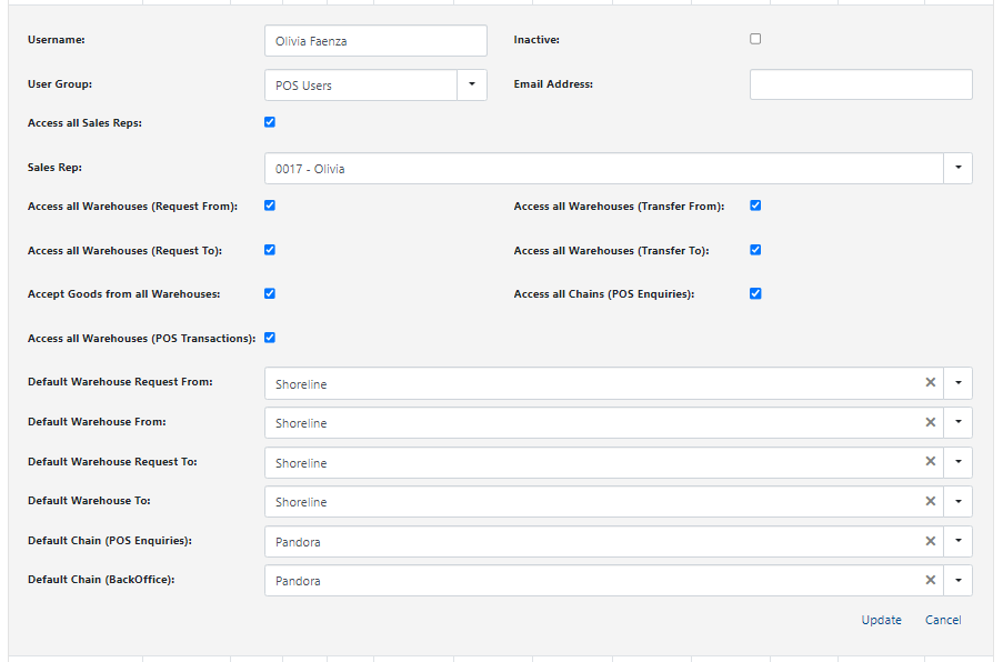 3. The easiest way is to see the rights and the fields for another user, so you can open another user on "Edit" in the new tab and copy the fields you need. For example, for the store POS this is the setup - this is the data for an POS User in the Shoreline store. Email field is not mandatory. If you are happy with your User data, click on "Update" in the down right corner. If you need a new "Sales Rep" please follow instructions here
