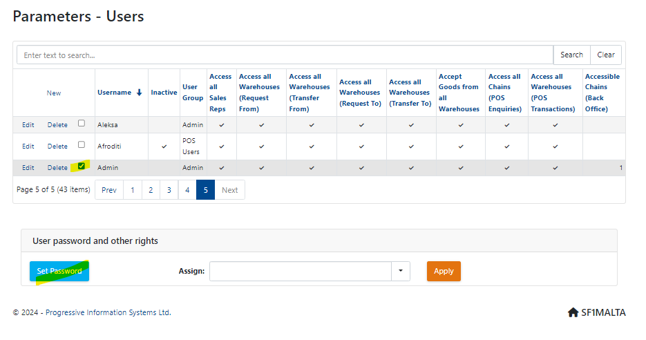5. Your new User now exists in the system, but he does not have a password, so click on a checkbox next to User Name and then click on "Set Password"