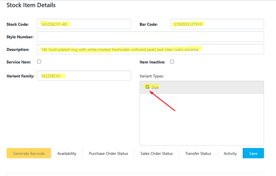 e) If the product is a variant, ensure the "Size" option is ticked in the "Variant Types" field. This is important for creating a configurable product for variants on the website.