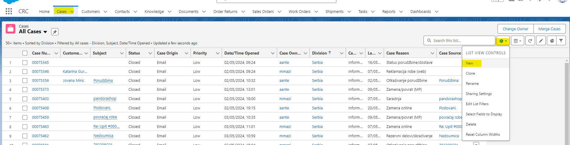 In the CRC module, Go to Cases, then click on a gear wheel icon (List view control) and then New