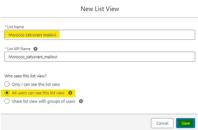 You will get a pop-up, fill in the "List name" (List API Name will be filled in automatically) and click on "All users can see this list view", then click Save.