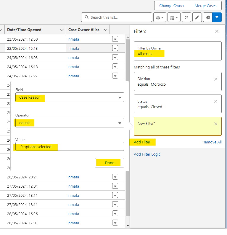 Go to Add Filter and choose the value you want to filter out. It can be a Division (country), Case reason, Status, Date/Time opened, Date/Time Closed or any other filter you consider relevant for your search.