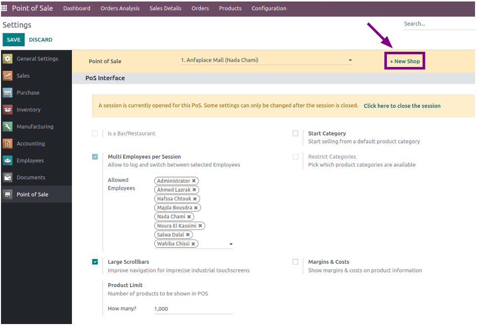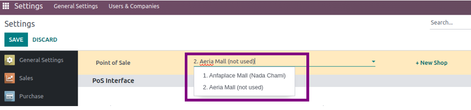 To configure your new shop, navigate to Point of Sale > Configuration > Settings. From there, select the specific shop you want to configure.