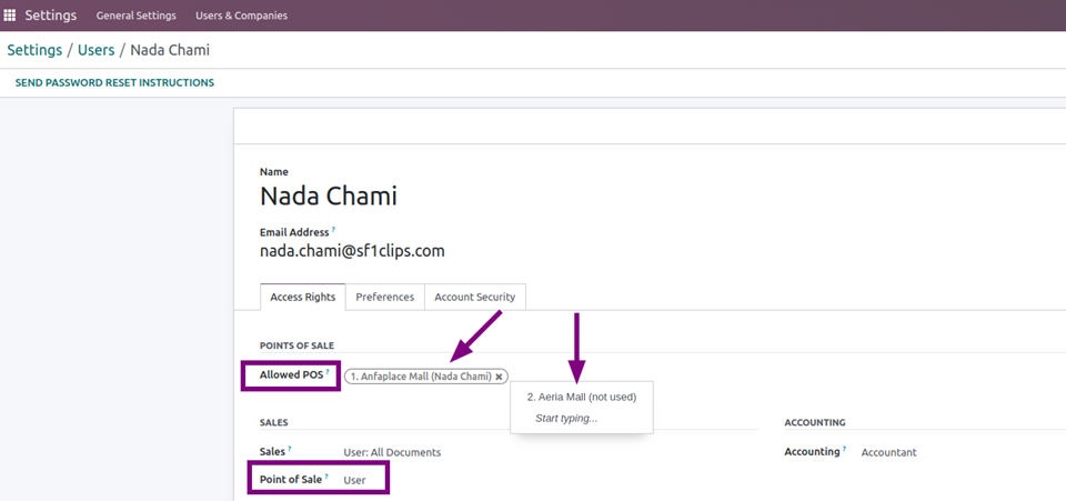 Once a new shop is created, you can set permissions for who can access the shop. By default, the POS admin role can access every shop. However, for the POS user role, you can specify access permissions for each shop separately. To do this, open the user forms in Settings > Manage Users. Select the POS user and specify the allowed POS locations by selecting them.