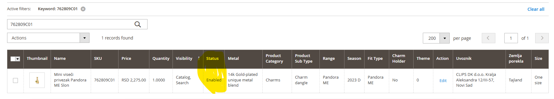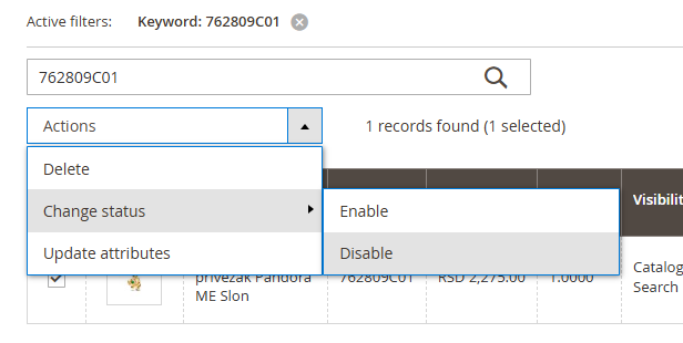 Označite proizvod, idite na Actions - Change status - Disable za isključivanje artikla, Enable za uključivanje.