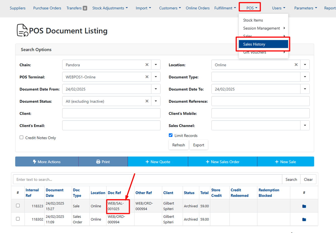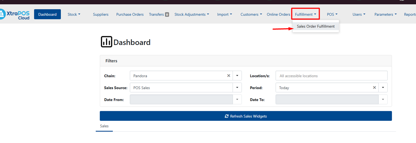 Kako bismo uneli broj fakture u Magento, potrebno je u XPOSu otići na dugme POS, pa Sales History, kao na slici. U Magento unosimo zaokružen broj fakture koji je označen strelicom. Od filtera nije potrebno dirati i nameštati bilo šta.