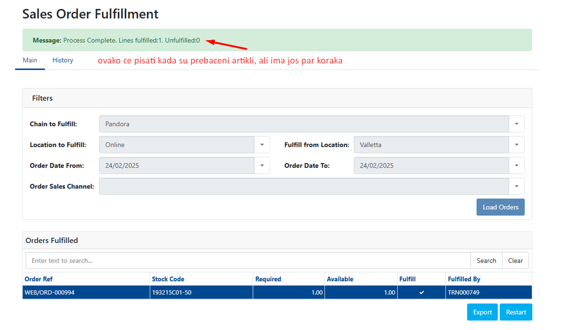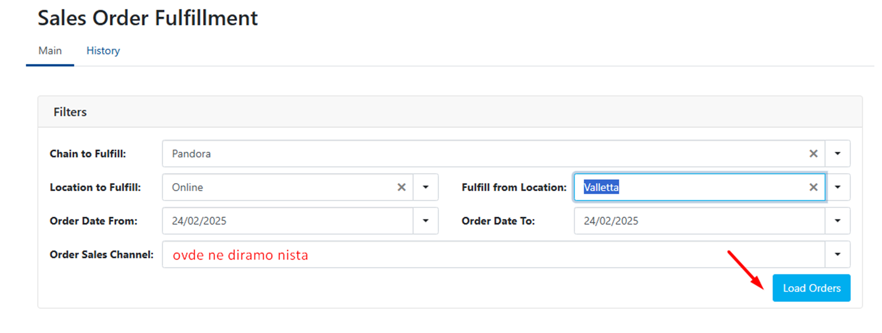 Kada smo uneli potreban info, tj. skladišta i datum, idemo na Load Orders i pustimo da učita sve artikle