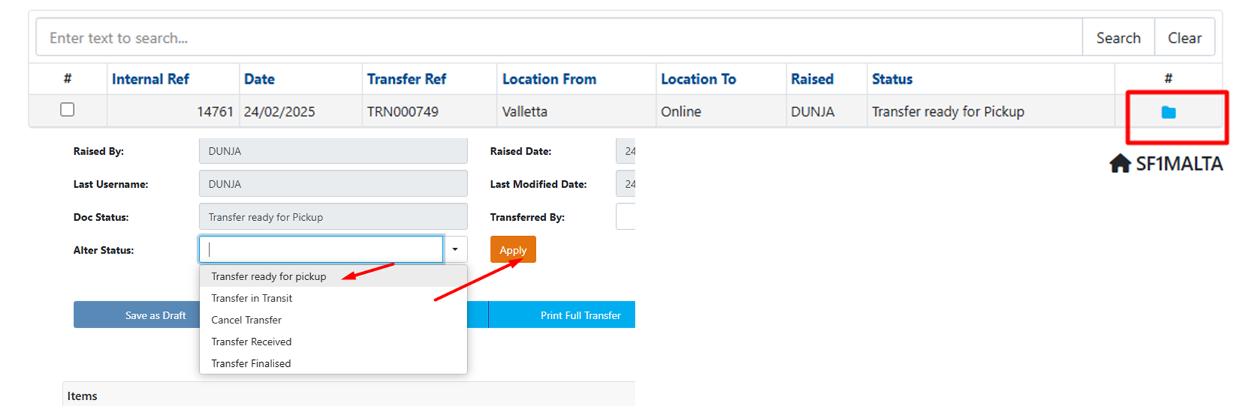 Posle svake promene statusa transfera, potrebno je ići na dugme Apply.