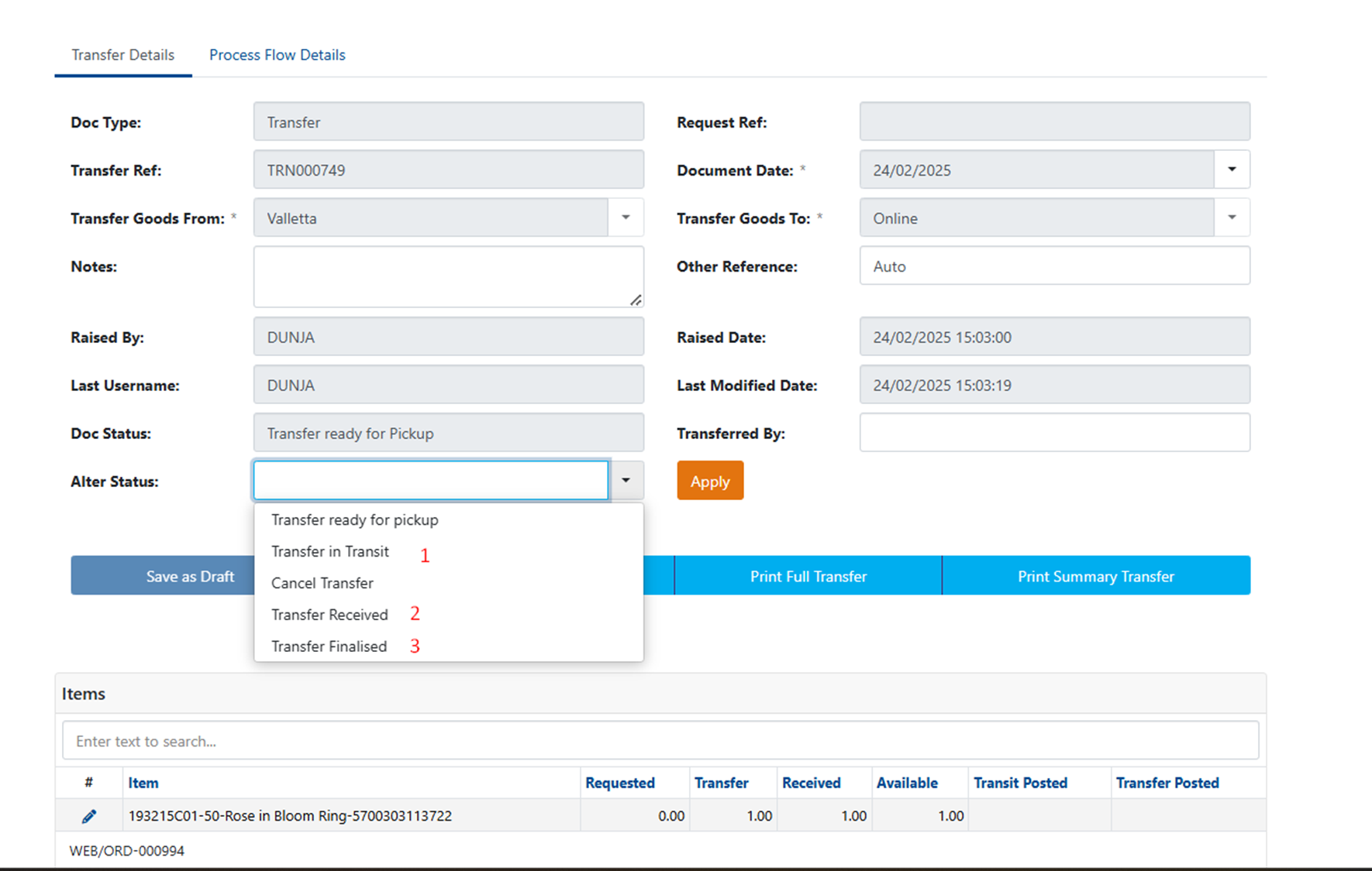 •Posle toga ga treba promeniti na status Transfer in transit, pa Transfer received i na kraju Transfer finalised.