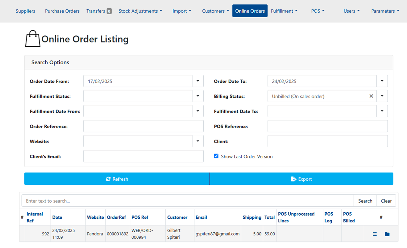 Kada smo završili proces knjiženja prenosnica i sad imamo artikle na WEBU, idemo na dugme Online Orders, vratimo datume unazad jer nam sistem po default-u pokazuje samo današnje ordere, a to ne treba da bude slučaj i kad namestimo taj filter idemo na dugme REFRESH