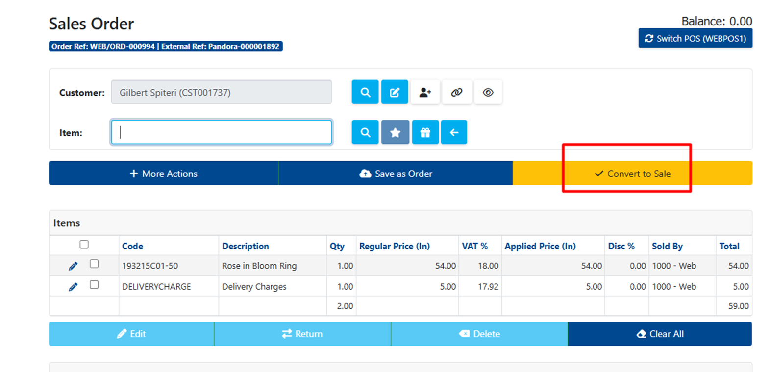 U order ulazimo tako što pritisnemo ikonicu malenog foldera i to nam otvori Sales Order (to je da kažemo neki kostur ordera, još uvek nije fiskalizovano, dakle, kao neki nalog za prenos ili nefiskalizovani KB u MISu npr.) i odemo na Convert to Sale. Ova akcija će promeniti draft invoice u legitimnu prodaju kao na sledećem slajdu