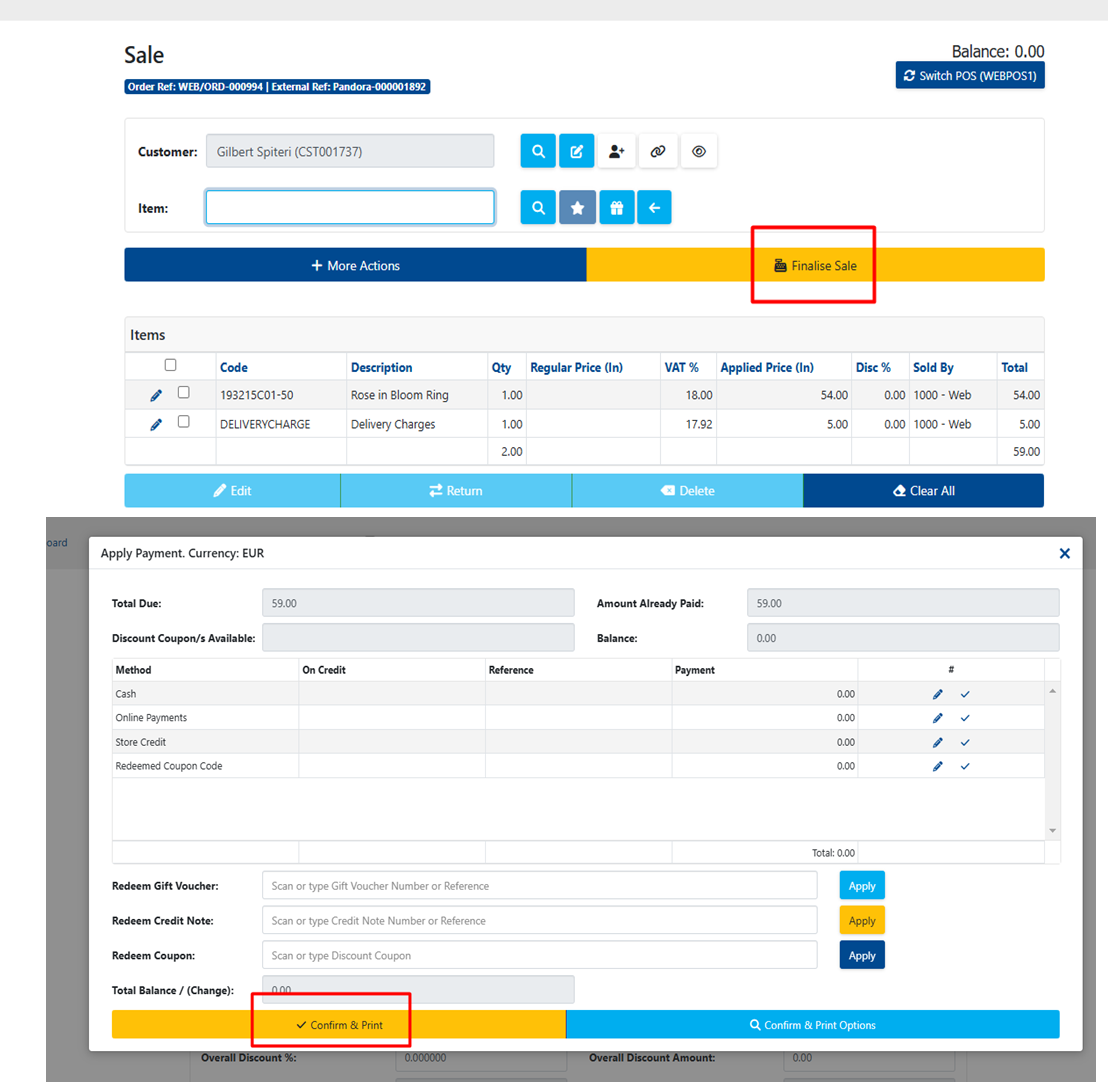 Dugme Finalise Sale će dalje fiskalizovati račun i tom akcijom će se trigerovati novi pop up prozor na kome ne treba ništa modifikovati već samo ići na ŽUTO DUGME iliti Confirm & Print.