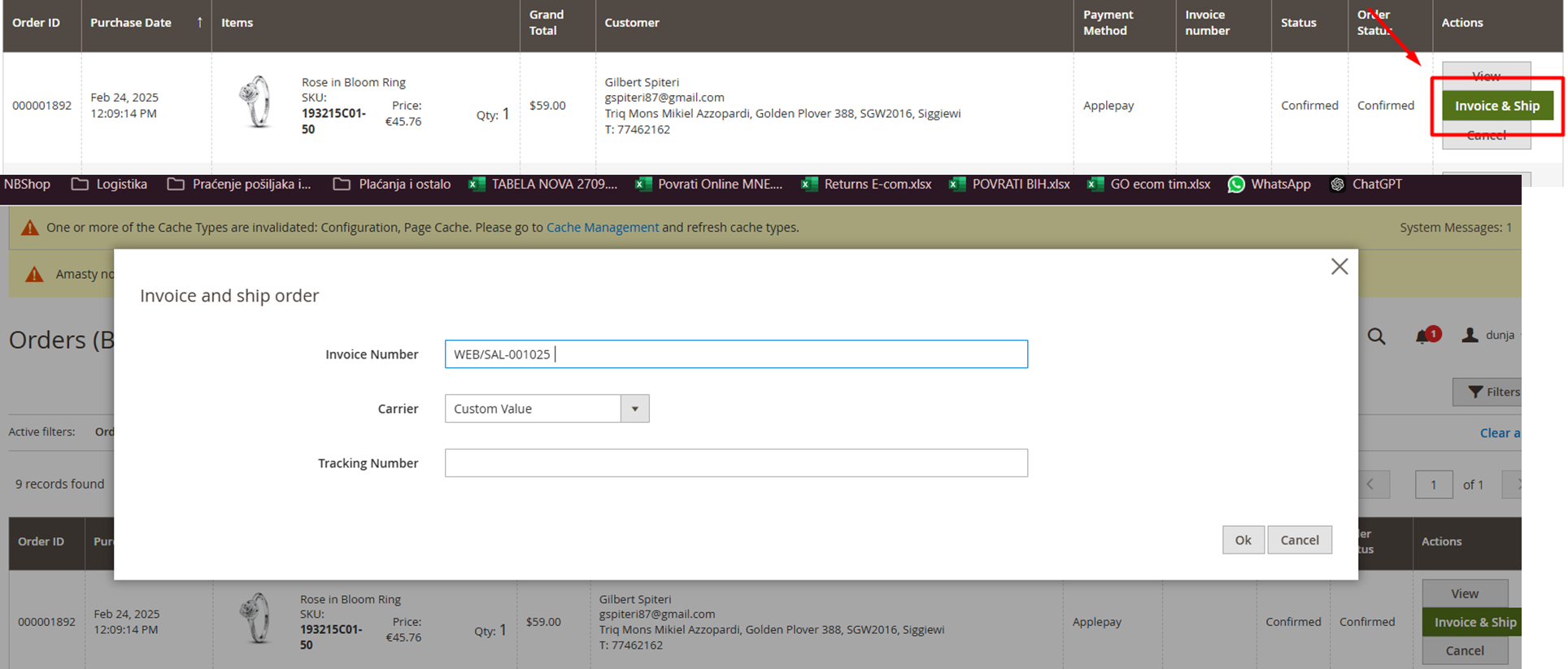 Kada smo podesili filter Confirmed i pritisnuli Apply, izbaciće nam samo ordere koji su u tom statusu, a prepoznaćemo ih tako što na njima piše Invoice&Ship, kao na slici ispod. Invoice&Ship nam otvara novi pop up prozor na kome unosimo broj fakture iz XPOSa i idemo na OK. Ovaj order je sada prešao na status Complete