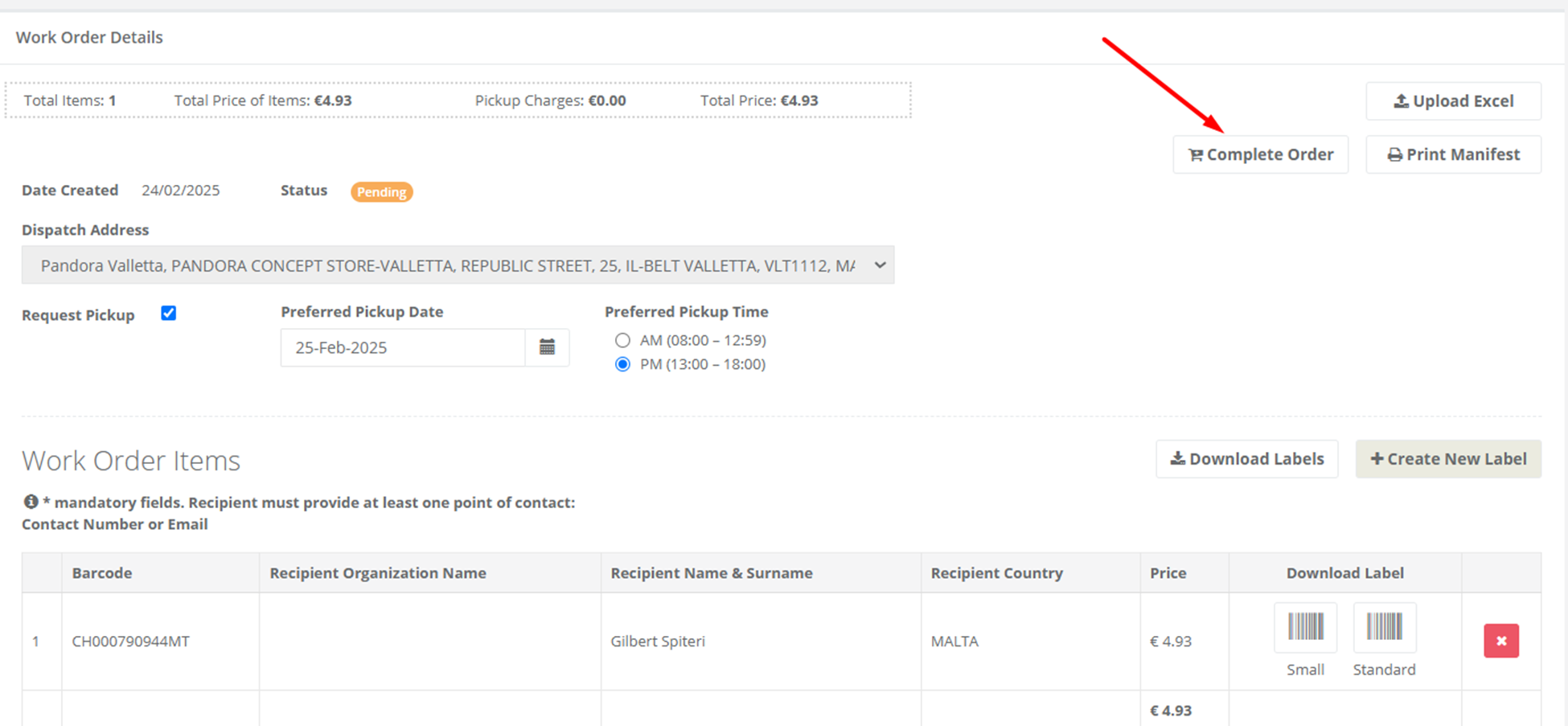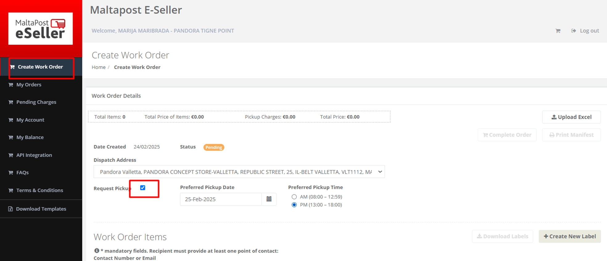•Create work order, Request pickup i odaberemo vreme. Orderi procesuirani DO 11 svakog dana mogu biti preuzeti taj dan