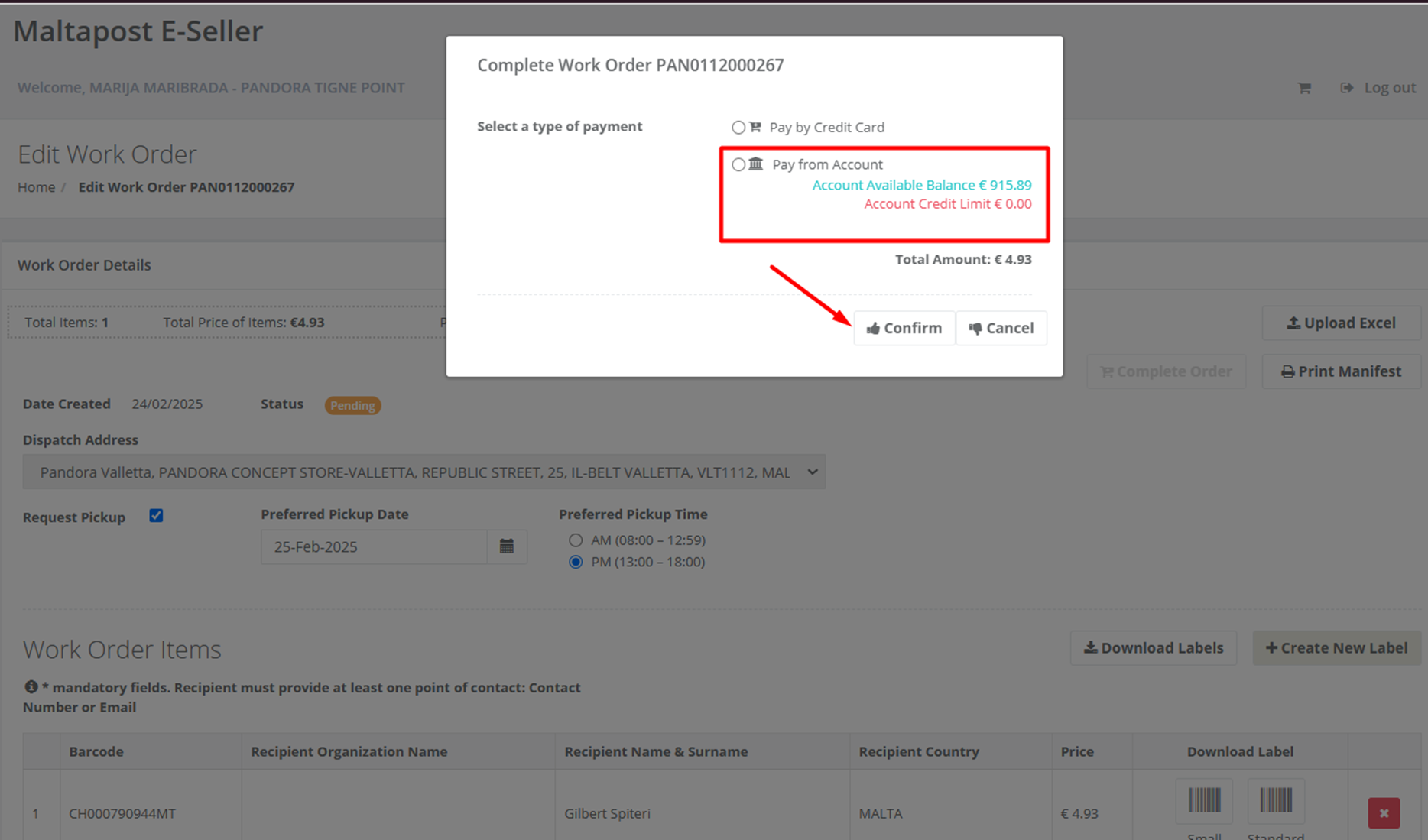 •Kada smo završili sa time, idemo na Complete order i tu odaberemo da platimo work order Pay from Account čekiramo dugme i odemo na Confirm