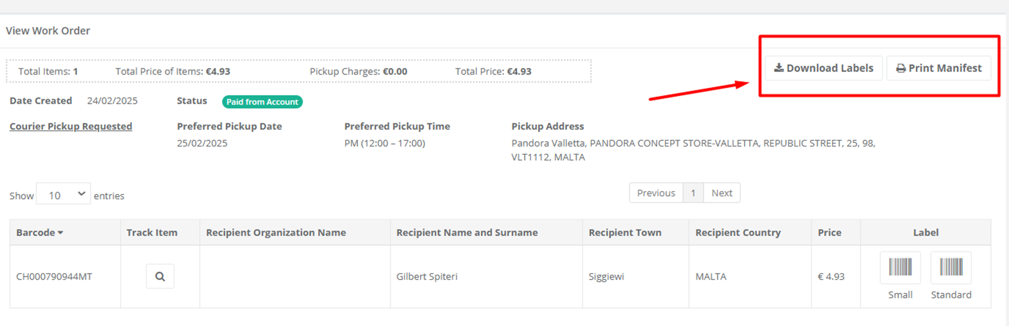•TEK KADA JE ORDER PLAĆEN, kliknemo na Work order sa spiska (uvek je prvi u nizu) i idemo da skinemo PDF adresnice i manifest za Irinu