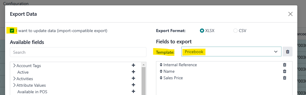 5. In the popup window choose Checkbox "I want to update data" and on Template choose from the dropdown menu "Pricebook". In the same popup click on Export, this will download the entire pricebook for KSA in Excel sheet, you can update the prices in Excel.