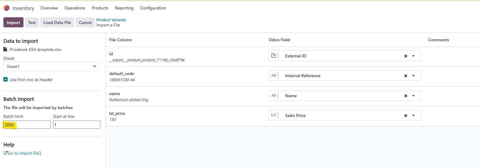 6. Once you have updated the prices in Excel by changing only the column D (lst_price) you can again import the prices in Odoo.