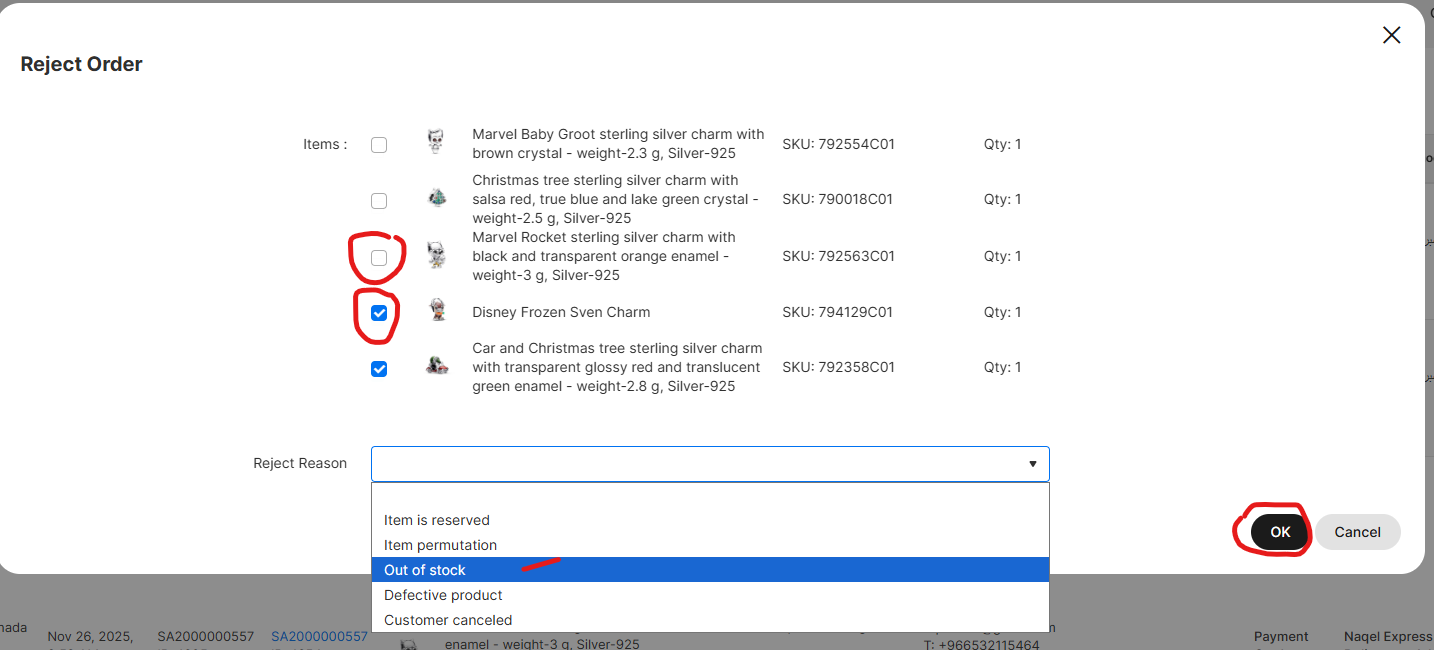 5. Reject only the products you don't have, select the reason why you don't have them, and click OK