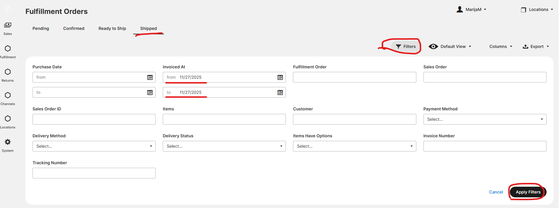 4. Orders are now in Status Shipped, with all the documents ready. Go to filters, select today's date in the field Invoiced At, and then go to Apply Filters.