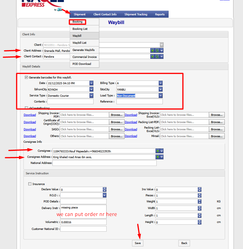 Go to Shipment - Booking and then fill in our data and customer data. Save.
