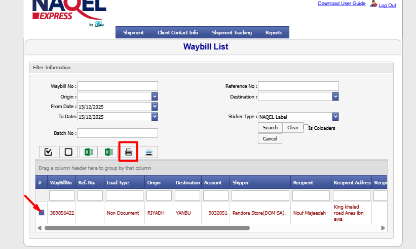 Print out waybill by selecting it and then clicking on printer
