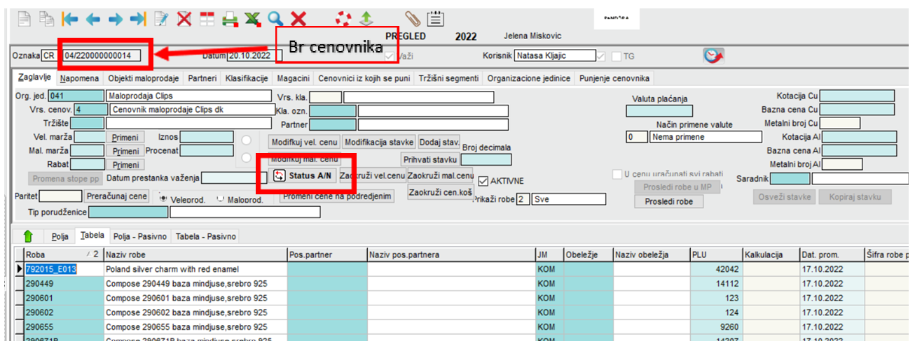 Zatim isim koracima doci do cenovnika koji treba da se aktivira, dvoklik I na isto dugme klik “Status A/N” se aktivira vazeci cenovnik